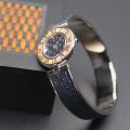ショップチャンネルで有名なデザイナー、原 久(HISASHI HARA)デザイン。 小型ムーブメントを搭載の印伝イメージ満載のゴールド貼付けフェース。 ベゼルにはローマ数字を深く彫刻して判読性を高めています。 りゅうずにもカボーションを搭載。 使い勝手の良いバングルタイプです。 ワンタッチ開閉のバックルですので利便性が抜群。 バングルの表面には甲府の匠による濃紺の印伝の鹿革を貼り付けて高級感が漂います。 心地良い装着感を楽しめます。