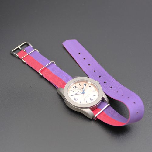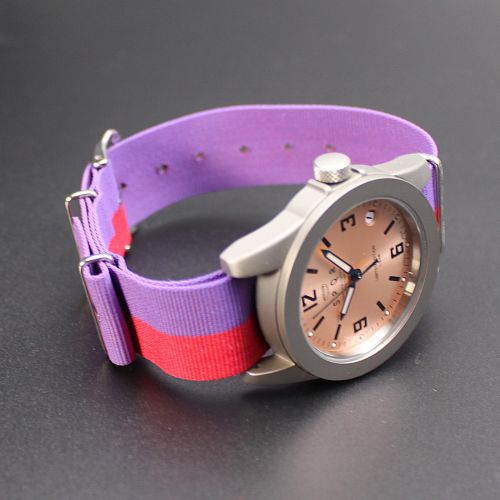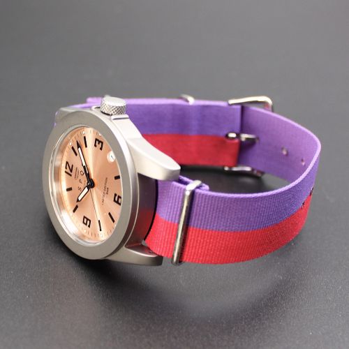 SPQRが英国のMOD(Ministry of Defence・英国防省)認定のコントラクターで製造したカラーストライプ柄のナイロンバンドを直接調達しました。 レジメンタルとはNATO軍のある連隊(レジメンタル)を示す色で#で示しています。 どの連隊なのかはNATOからは絶対に公表されません。 量産の余剰品を特別に分けていただきました。 従いまして現在の在庫が終われば当面は再生産しない貴重なアイテムです。 本品はレジメンタル#21です。