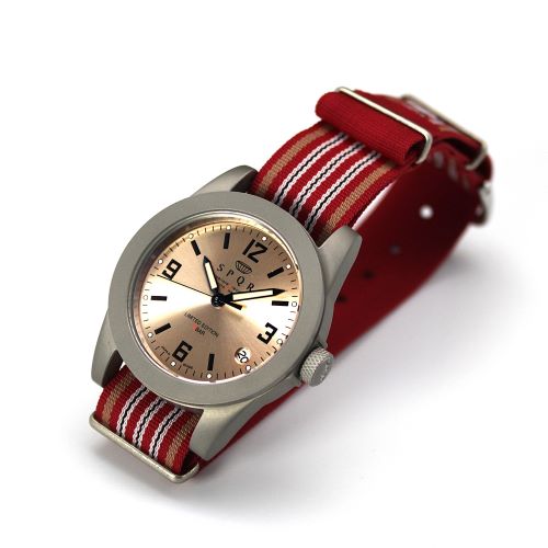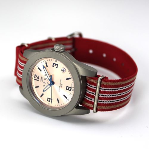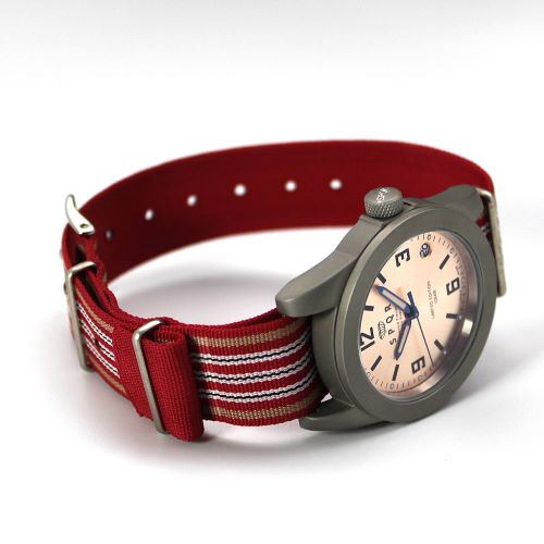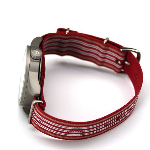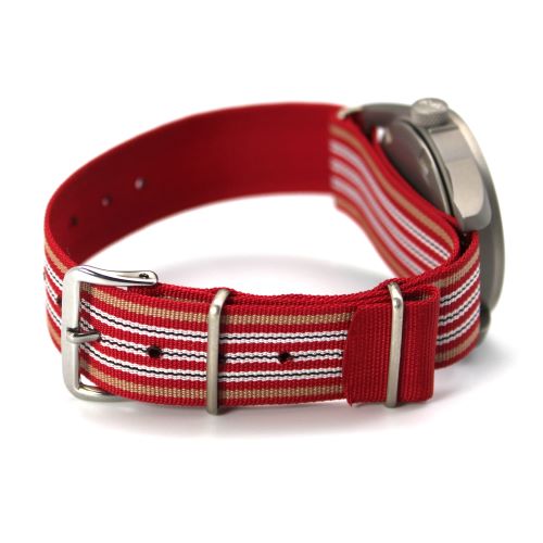 SPQRが英国のMOD(Ministry of Defence・英国防省)認定のコントラクターで製造したカラーストライプ柄のナイロンバンドを直接調達しました。 レジメンタルとはNATO軍のある連隊(レジメンタル)を示す色で#で示しています。 どの連隊なのかはNATOからは絶対に公表されません。 量産の余剰品を特別に分けていただきました。 従いまして現在の在庫が終われば当面は再生産しない貴重なアイテムです。 本品はレジメンタル#4です。