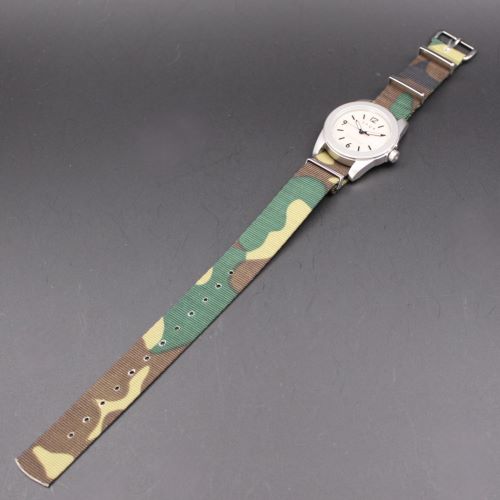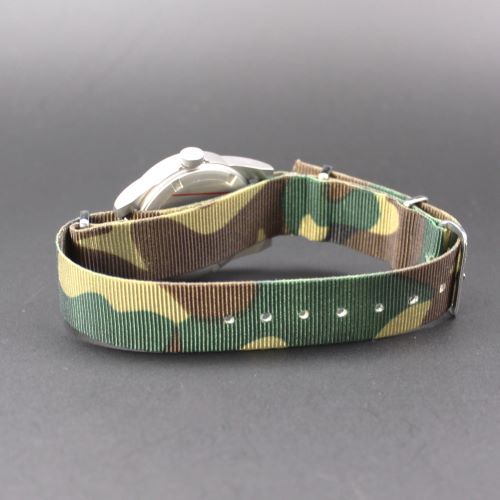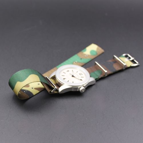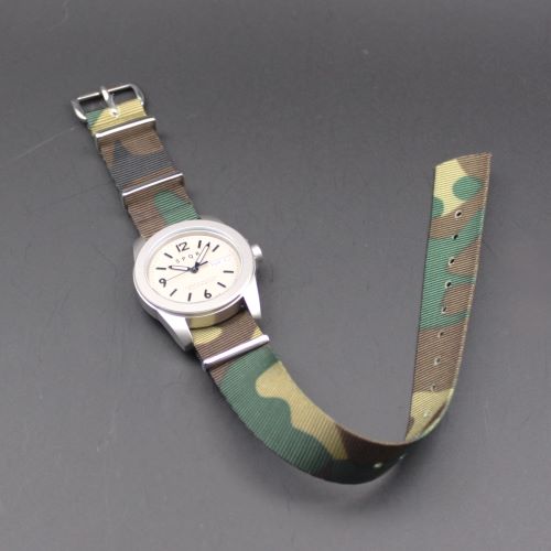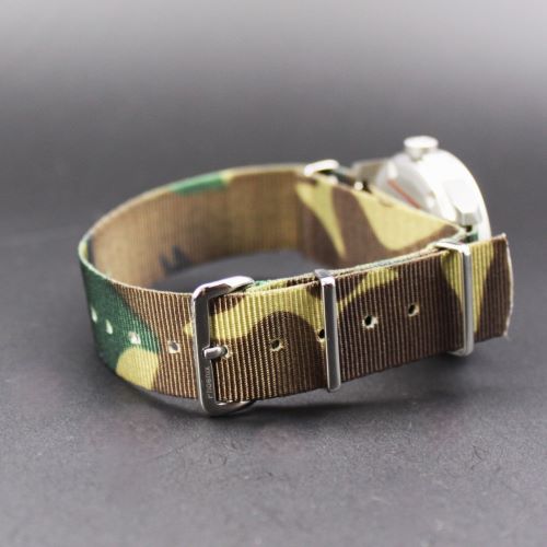 ◆商品名:MOD・NATOストラップ ◆商品コード:NS-KF01 ◆色:カモフラージュ ◆素材:Nylonribbon ◆バックル:Brass+クロームメッキ ◆幅:18mm ◆全長:280mm ◆ウォッチ装着部長さ:60mm ◆厚み:1.2mm ◆原産国:英国