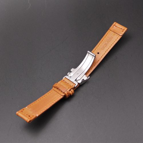 日本で唯一の馬具工房 ソメスサドル社 から生まれた馬具職人手縫い時計ストラップ。 時計企画室コスタンテとの共同開発のため他では入手できません。 ソメス社が厳選したソフトカーフレザーを丹念に仕上げています。 人気カラーのキャメルカーフは独特のやわらか味のある風合いで、繊細な肌触りですので、使い込む程に愛着が湧き、いい味を醸し出します。 バックルはU形状をしたミラー仕上のテンレスでワンプッシュ開閉式三つ折れタイプですので簡便な脱着が可能となり、腕からの落下防止に貢献します。