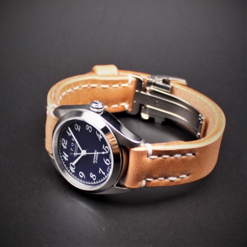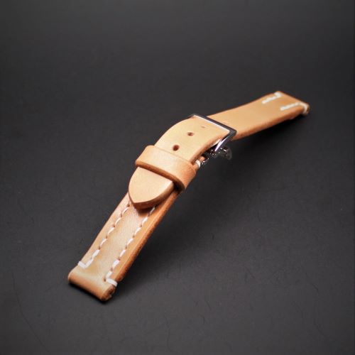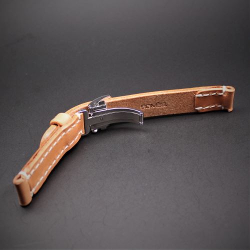 日本で唯一の馬具工房 ソメスサドル社 から生まれた馬具職人手縫い時計ストラップ。 時計企画室コスタンテとの共同開発のため他では入手できません。 SOMES社が厳選したサドルレザーを丹念に仕上げています。 独特のやわらか味のある風合いで、繊細な肌触りですので、使い込む程に愛着が湧き、いい味を醸し出します。 バックルはU形状をしたミラー仕上のステンレス製で三つ折れタイプですので腕からの落下防止に貢献します。 腕回りに自信のある方むけで国内基準バンドのサイズより約5cm長いサイズです。