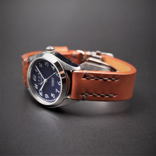 日本で唯一の馬具工房 ソメスサドル社 から生まれた馬具職人手縫い時計ストラップ。 時計企画室コスタンテとの共同開発のため他では入手できません。 SOMES社が厳選したサドルレザーを丹念に仕上げています。 独特のやわらか味のある風合いで、繊細な肌触りですので、使い込む程に愛着が湧き、いい味を醸し出します。 バックルはU形状をしたミラー仕上のステンレス製で三つ折れタイプですので腕からの落下防止に貢献します。