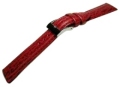 革巾18mm、バックル16mmのテーパ形です。素材は牛革ですが高級感溢れるシャーク型押しバンドです。裏はベージュの薄革となっています。色は落ち着いたレッドです。バックルはミラー仕上のステンレススチールです。 どんな時計にもさりげなくフィットする大変おしゃれな優しいバンドです。
