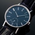 この時計の名称にもなっている 「urush ikiso small second」 は木曽平沢の熟練した職人である伝統工芸士である 荻上 文峰氏 が多くの工程をすべて手作業を重ねて作っています。ウルシ科に属する植物は世界中で約600種類を数えます。樹液が塗料として使用できる木は、日本を含め東南アジアのみに生息していますが、品質的には日本のものが優れています。 漆の木が育ち樹液を採取できる迄には15年~20年という長い年月が必要で、1本の木から採取できる量はわずかです。 さらにその上、熟練した漆掻きによる手作業により、一滴一滴、時間をかけて集めた貴重品です。 ロレットなしのシンプルデザインのりゅうずのトップにも文字盤と同じ濃藍の漆を埋め込んで120度で焼き付け加工を施してあります。