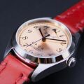世界的にも希少なパワーリザーブ機能を搭載!残りの駆動時間をインジケーターで表示します。電池交換が不要で、動力を与える限り半永久的に動き続けます。 文字盤はやわらかなアラビア文字をレイアウトしたアイボリー、ブラック、ピンク、ネイビーの4色、高級時計に使われるラッピング仕上を施し、高級感を演出しています。 アイボリーとピンク文字盤に搭載のブルー針のカラーリングはブルーIP(イオンプレーティング)を採用しています。 電子イオン化したチタンを蒸着させる着色法で、光の屈折により深いメタリックブルーの色合いが変化します。 裏蓋はスケルトン構造を採用していますので、自動巻き方式の機械ムーブメントの精密な動きを楽しめます。 植物性タンニンなめしによる繊細かつしなやかな感触のSOMESサドルレザーバンドは使うほどに風合いが増します。 他社に真似の出来ないこだわりが多くのお客様から絶大な支持を受けています。 細部までしっかりと造りこまれたこだわりの腕時計。男心を揺さぶる妙味いっぱいの業物です。