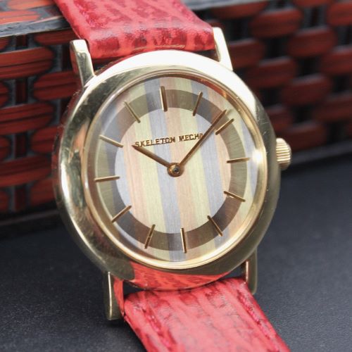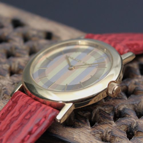 ショップチャンネルで有名なデザイナー、原 久(HISASHI HARA)デザイン。 ケースはK18素材Ф23m径、7mm厚みのレディスサイズ。 文字盤は国内大手の金属メーカーとの共同開発した三色金(ピンクゴールド、イエローゴールド、ホワイトゴールド)ストライブ模様。 手巻き機械式の2針ムーブメント(17JEWELS)を搭載。 バンドはワインレッドのシャーク素材の組み合わせ。