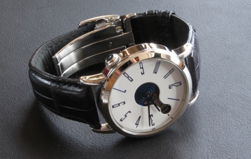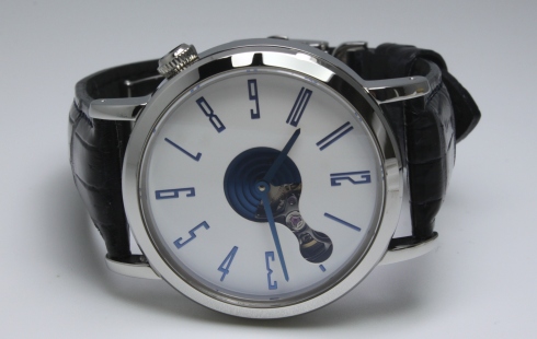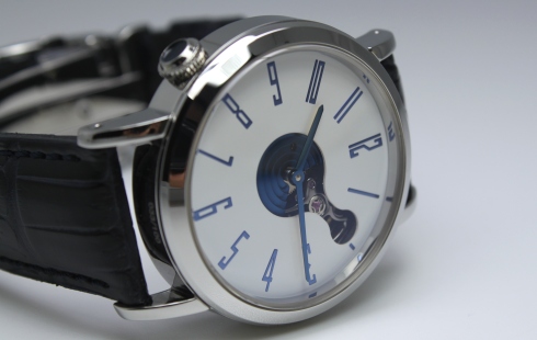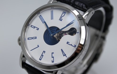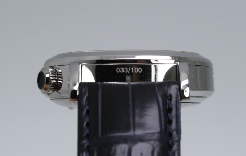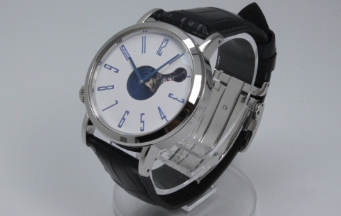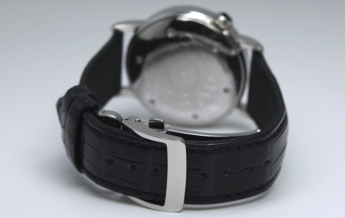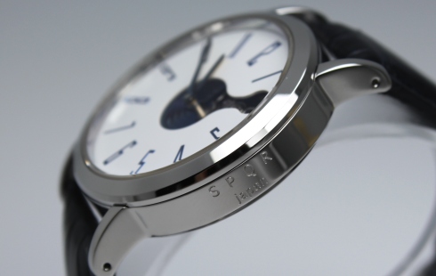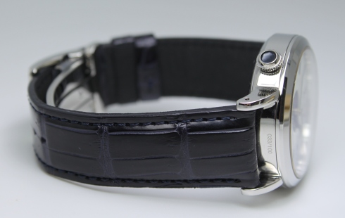 当ウォッチの為に新開発したクリーンエネルギー国産機械式ムーブメント(オリエント時計製造)の中二針・手巻付き自動巻き・てんぷスケルトン・黒メッキ特別仕様を採用。ネオ・ジャパネスク(新しい日本風)なデザインで、日本古来からの庭園に砂で描かれた波紋を表現する為に、精密加工の円周状の波紋をシャンパンブルーで演出。操作性の高いたまねぎ型リューズのトップには文字盤と同じ、ジャパンブルーの漆を埋め込み高級感を演出しました。バンドは、国内有数のハンドメイドによる濃紺のオイルマット仕上げの最高級クロコダイルバンドを採用。