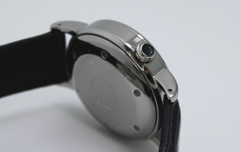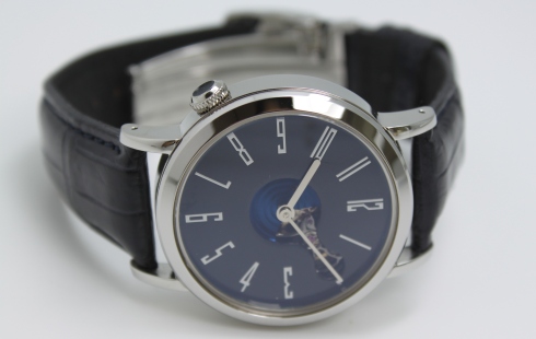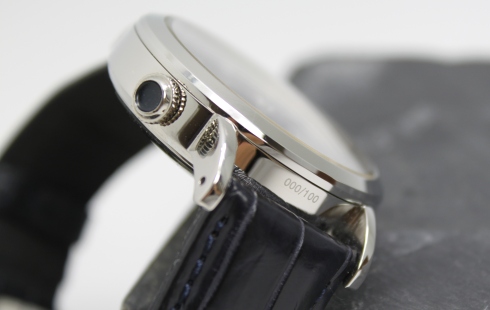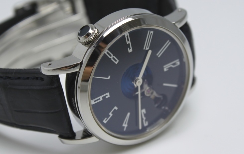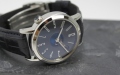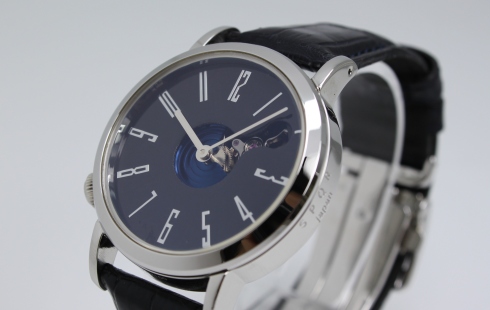 当ウォッチの為に新開発したクリーンエネルギー国産機械式ムーブメント(オリエント時計製造)の中二針・手巻付き自動巻き・てんぷスケルトン・黒メッキ特別仕様を採用。ネオ・ジャパネスク(新しい日本風)なデザインで、精密加工の円周状の波紋をシャンパンブルーで演出。操作性の高いたまねぎ型リューズのトップには文字盤と同じ、ジャパンブルーの漆を埋め込み高級感を演出しました。バンドは、国内有数のハンドメイドによる濃紺のオイルマット仕上げの最高級クロコダイルバンドを採用。