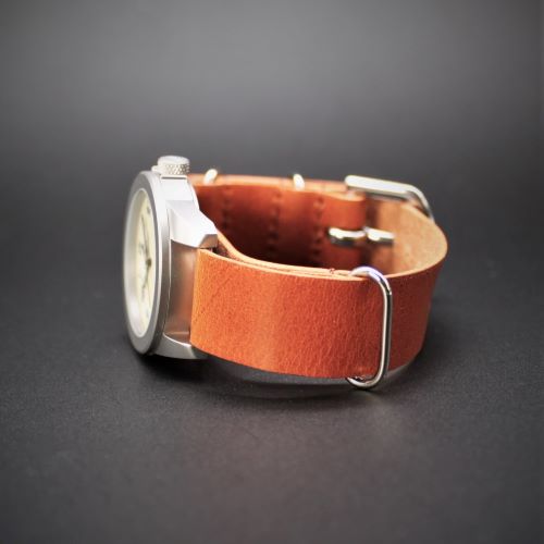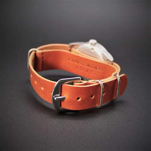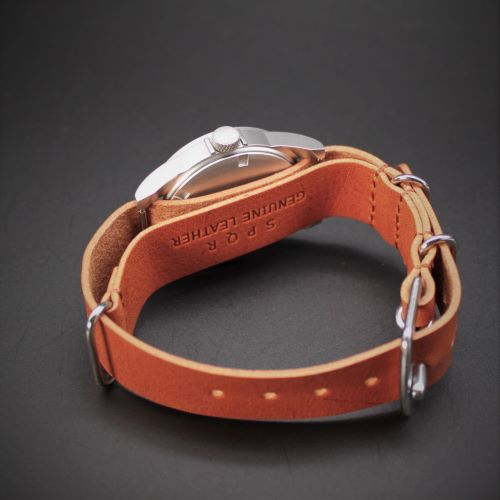 SPQR自信のオリジナルバンドは日本製のNATOタイプのレザーストラップです。 原皮の仕入れからなめしまでを行う日本でも数少ないタンナーで造られた革 【栃木レザー】 です。 世界でもまれな「ダブルピット製法」で約1か月という長い時間をかけてタンニンを革の芯まで浸透させ美しく堅牢な革に仕上げてあります。 その革を熟練の職人が一点づつ裁断及び縫製をしました。 「NATOタイプ」とよばれる使い勝手のよい裏通しタイプですので高い利便性を誇ります。 レザー裏面は加熱処理でスムースな表面に仕上げ 【SPQR GENUINE LEATHER】 と刻印してあります。 裏通しですので専用工具なしで、ご自身で簡単にバンド装着、交換が可能です。 バックルはドイツの馬具メーカーが創るステンレスの高い耐久性を誇ります。 色は人気の高い4色からお選び戴けます。