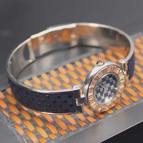 【原 久デザイン 伝統工芸の甲州印伝 レディス ローマ数字・彫刻ベゼル+シルバー模様文字盤 ・針× 印伝貼付けバングル(ワンタッチ開閉)】 【特別価格50%LESS 1本限定】
