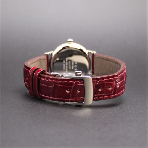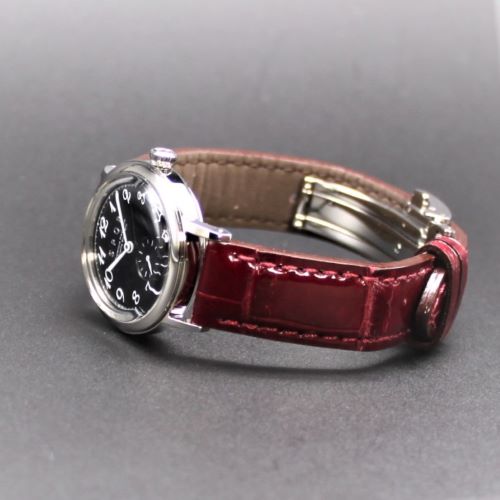 バンドは高級クロコダイル・ワインレッドです。 肌に優しく密着できる繊細 さで快適な装着感で快適です。 バックルは堅牢なミラー仕上のステンレス製のUタイプです。
